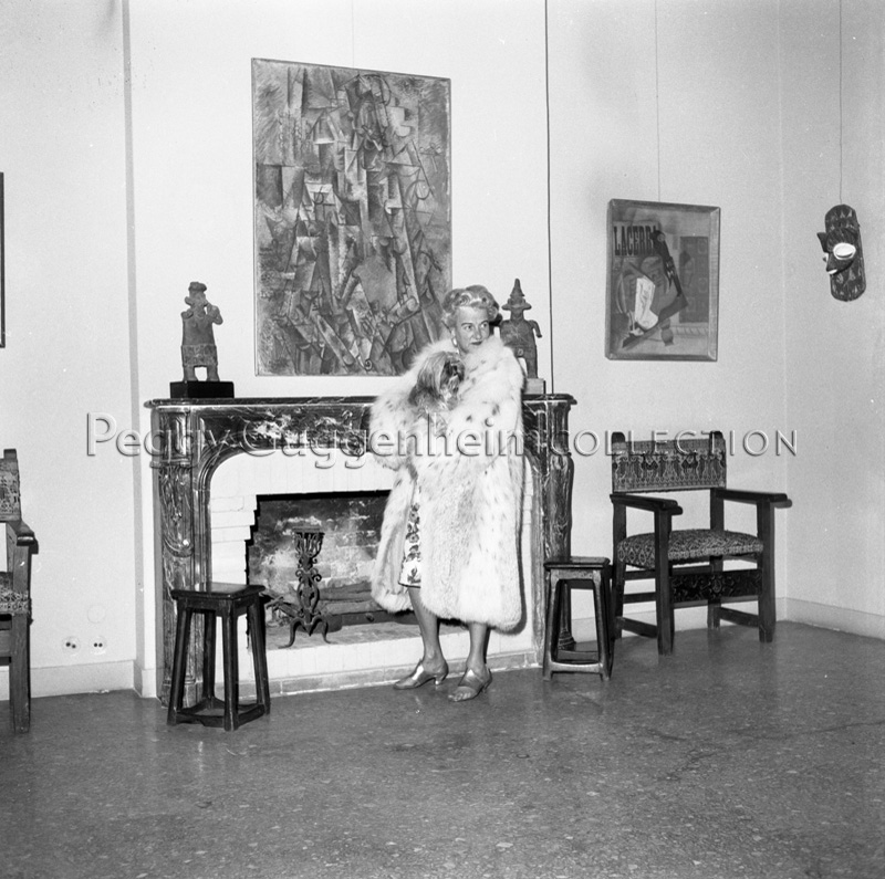 L'immagine ritrae Peggy Guggenheim a Palazzo Venier dei Leoni. Peggy, che indossa una pelliccia, è ripresa davanti ad un caminetto con uno dei suoi cani Lhasa Apsos Terrier in braccio. Si vedono alla parete le tele di Pablo Picasso "Il poeta" (1911, Peggy Guggenheim Collection) e "Pipa, bicchiere, bottiglia di Vieux Marc" (1914, Peggy Guggenheim Collection). Sopra il caminetto sono collocate due sculture in terracotta provenienti dalle Americhe, precisamente "Figura femminile" (Peggy Guggenheim Collection, PG264) e "Figura maschile" (Peggy Guggenheim Collection, PG265).