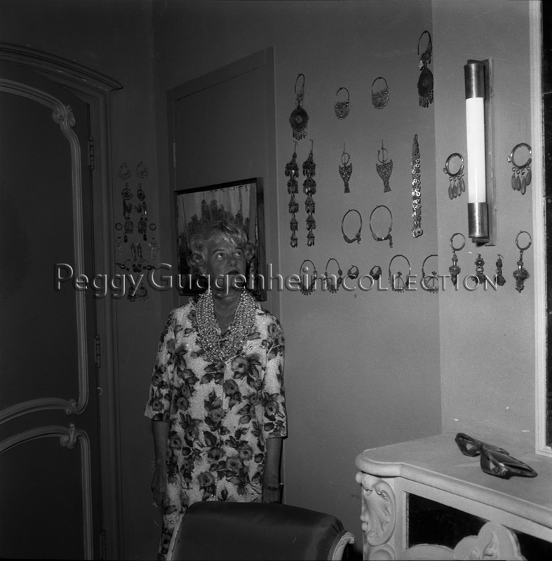L'immagine ritrae Peggy Guggenheim nella sua camera da letto a Palazzo Venier dei Leoni mentre osserva attentamente la sua collezione di orecchini raccolta durante i suoi numerosi viaggi. Alle spalle di Peggy si scorge in parte la tela di William Congdon "Cambogia" (1960, Peggy Guggenheim Collection). Appoggiati sopra il caminetto della stanza ci sono un paio di occhiali molto grandi appartenuti alla collezionista americana.