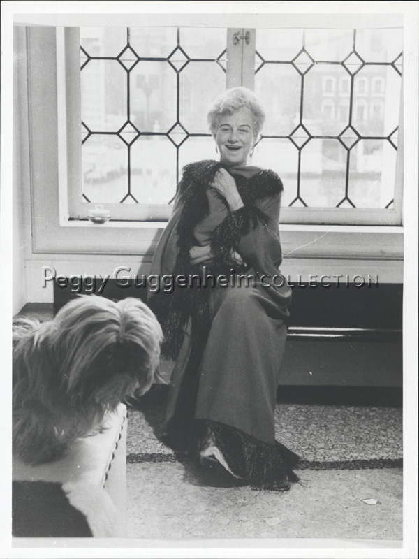 Servizio fotografico: Peggy Guggenheim con mantello dal bordo nero, davanti alla finestra