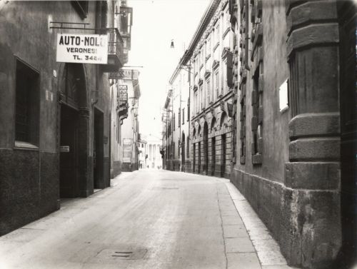 Sul fondo veduta del Municipio, a sinistra ingresso negozio con la targa "Bressanini"