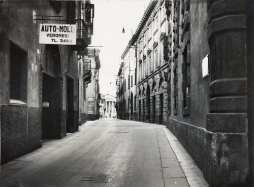 Sul fondo veduta del Municipio, a sinistra ingresso negozio con targa "Bressanini"