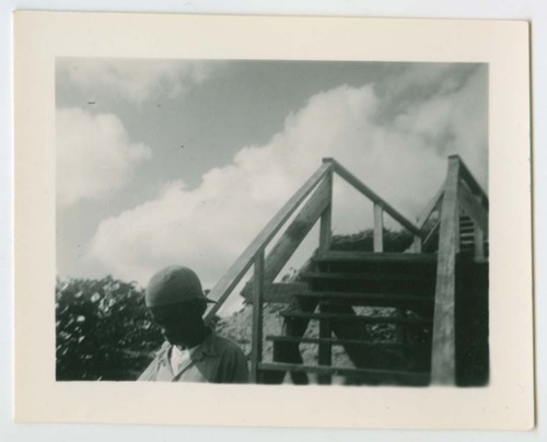 Un bambino di colore scende da una scala di legno. In cielo, fitte nuvole bianche.