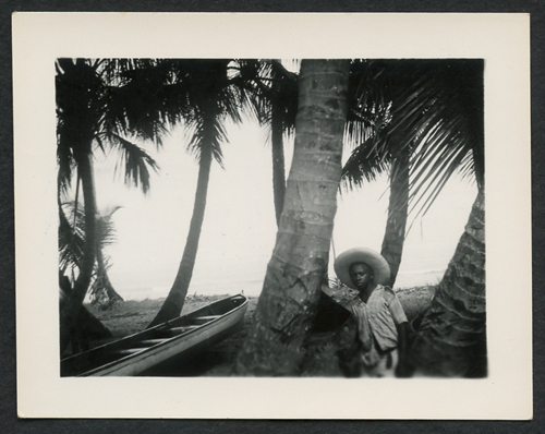 Barche e palme sulla spiaggia. In primo piano un abitante del luogo.