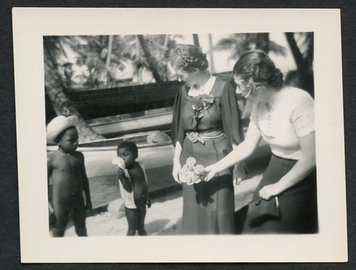 Due donne vestite secondo la moda degli anni Trenta parlano con due bambini oriundi, accanto a delle barche in secca sotto le palme.
