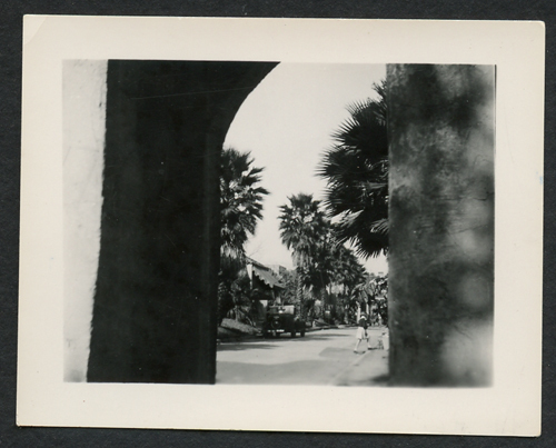Strada di New Orleans ripresa da sotto un porticato (si intravedono due pilastri). In strada un passante vestito di bianco e un'automobile scura parcheggiata sotto le palme.