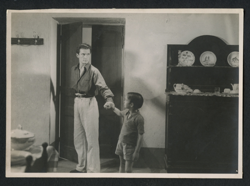 Uomo e bambino all'interno di una casa. Fotografia di scena del film di Francesco Pasinetti "Il Canale degli angeli" (1934).