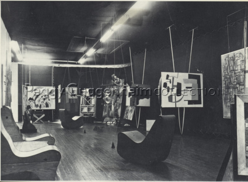 Sala dedicata all'arte astratta nella galleria Art of This Century di Peggy Guggenheim a New York nel 1942. Si possono individuare (da sinistra a destra) "Uomini in città (Les Hommes dans la ville)" di Fernand Léger del 1919 (PG21), "Boxing" di Archipenko del 1939, "Croce bianca" del 1922(PG34) e "Paesaggio con macchie rosse, n.2" del 1913 (PG33) di Vassilij Kandinskij, un dipinto di El Lissitskij del 1919-20 (PG43), un dipinto di Kazimir Malevich del 1916 (PG42), "Pittura rarissima sulla terra (Très rare tableau sur la terre)" di Francis Picabia del 1915 (PG67), "Costruzione di rapporti volumetrici... " di Georgesdel Vantongerloo del 1924 (PG59), "Composition No. 113" Vordemberge-Gildewart del 1939, "Arco di Petali " di Alexander Calder del 1941 (PG137), "Donna con animale" di Albert Gleizes del 1914 (PG17), "Superficie sviluppabile" di Antoine Pevsner del 1938-39 (PG61), "Mare=Ballerina" di Gino Severini del 1914 (PG32), "Guitar and Battles" di Ozenfant del 1920,"Testa e conchiglia" di Jean Arp del 1933 (PG54), "Uccello nello spazio" di Constantin Brancusi del 1932-40 (PG51), "Equilibrio (Equilibre)" di Jean Hélion del 193334 (PG44) e "Impalcatura: Studio per Tableau III (Scaffold: Study for Tableau III)" di Piet Mondrian del 1914 (PG37). Allestimento di Frederick Kisler. L'immagine è stata utilizzata per la realizzazione del manifesto pubblicato in occasione della mostra tenutasi nel 2003-2004 presso la Collezione Peggy Guggenheim di Venezia, dal titolo: "Peggy and Kiesler: the collector and the visionary".