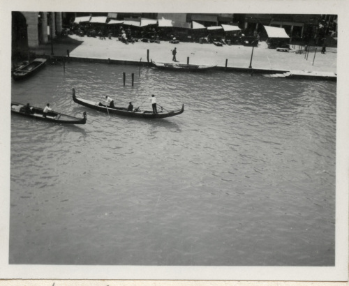 Ripresa, realizzata dall'alto, di un tratto del Canal Grande veneziano. Stanno passando due gondole.