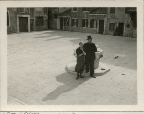 Ripresa di due individui anziani, un uomo e una donna, appoggiati a un pozzo di un tipico "campo" (piazza) veneziano.