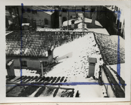 Ripresa, realizzata dall'alto, dei tetti veneziani innevati.