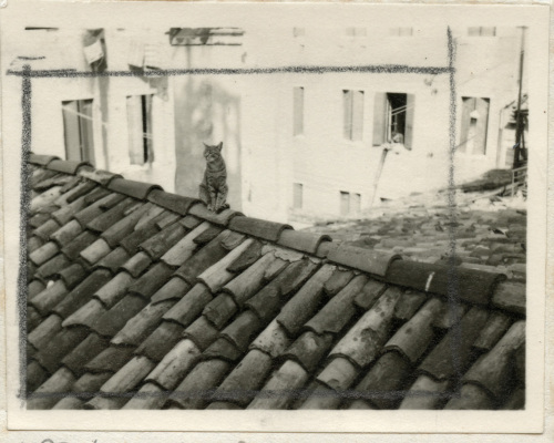 Ripresa, realizzata probabilmente da un tetto o da un'altana, di un gatto seduto sopra i coppi di un tetto.