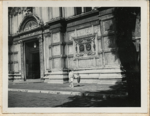 Ripresa di un particolare della facciata di un edificio veneziano. Sono riconoscibili due bambini che passeggiano di fronte all'edificio.