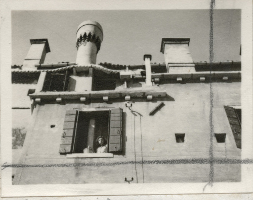 Ripresa della facciata di un edificio privato di Venezia. Affacciata ad una finestra, una giovane ragazza.