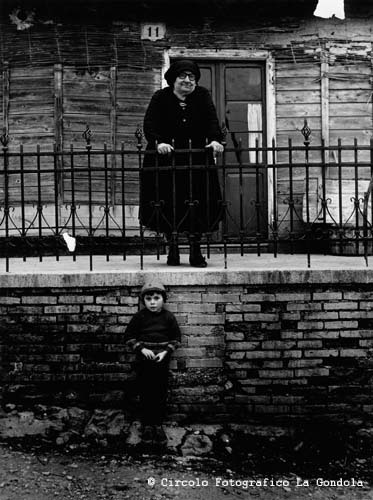 Ritratto di una donna anziana e di un bambino, in piedi, in abiti semplici, invernali. I due soggetti sono posti, rispettivamente, al livello superiore ed inferiore di una strada davanti all'uscio di un'abitazione dal civico numero 11.