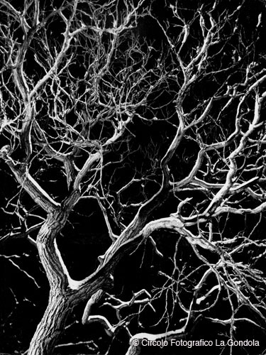 Ripresa notturna di rami secchi di un albero coperti da neve.