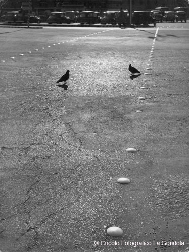 Due colombi immortalati sul cemento di un tratto di strada libera da automobili e pedoni. Sullo sfondo vi sono alcune macchine parcheggiate e un passante.