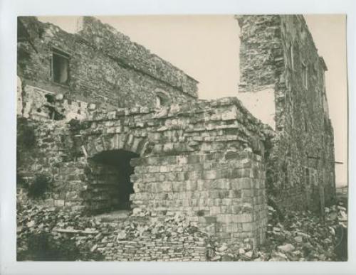 Riproduzione fotografica di quello che potrebbe essere il muro di un edificio civile, presumibilmente di Gorizia, gravemente danneggiato dai bombardamenti causati dalla Prima Guerra Mondiale.