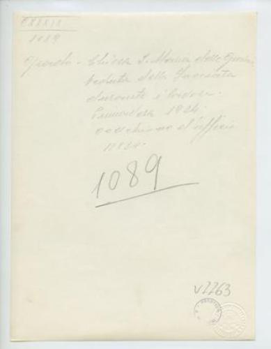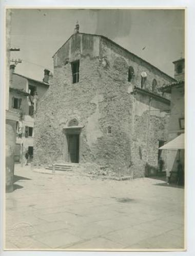 Riproduzione fotografica della facciata della Basilica di Santa Maria delle Grazie a Grado nella primavera del 1924. Sono in corso i lavori di restauro dell'edeficio a seguito dei danni causati dai bambardamenti della Prima Guerra Mondiale.