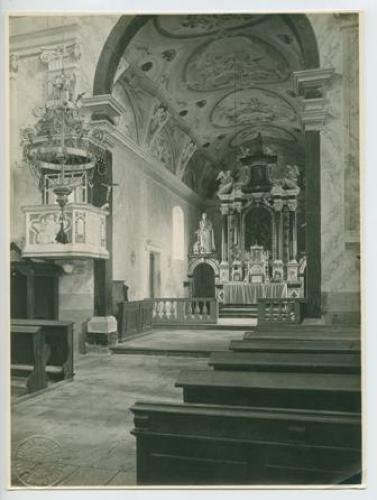 Riproduzione fotografica dell'interno di una chiesa che conserva alcuni affreschi di Giulio Quaglio a Oberschan (Slovenia).