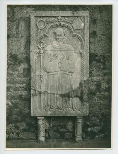 Riproduzione fotografica di una pietra tombale presente nel cortile del palazzo del vescovo a Osor (Ossero), sull'Isola di Cherso (Croazia).