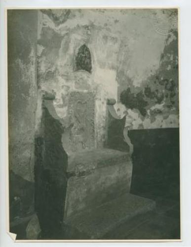 Riproduzione fotografica del leggio absidale in pietra, con decorazioni bizantine, custodito presso la chiesa del cimitero della cittadina di Osor (Ossero), sull'Isola di Cherso (Croazia).