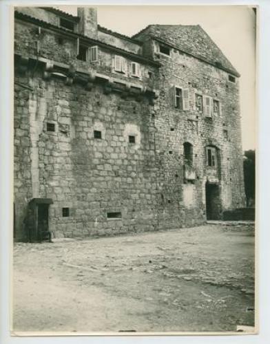 Riproduzione fotografica della facciate con ingresso del Castello di Montecuccoli, a Pazin (Pisino, Croazia).