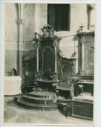 Riproduzione fotografica dello stallo ligneo custodito presso la chiesa parrocchiale di Pazin (Pisino, Croazia).