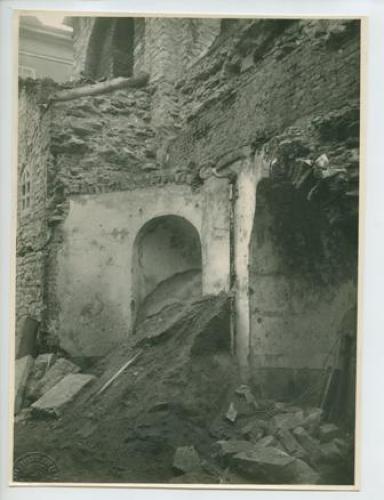 Riproduzione fotografica di una porzione esterna della Chiesa di Santa Maria del Canneto a Pula (Pola), in Croazia, durante i lavori di restauro.