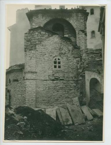 Riproduzione fotografica del fianco sinistro esterno della Chiesa di Santa Maria del Canneto a Pula (Pola), in Croazia, durante i lavori di restauro.