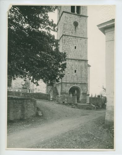 Riproduzione fotografica del campanile, ripreso dall'esterno, della Chiesa succursale di Sant'Egidio a Sveto (Sutta), frazione del Comune di Comeno, Slovenia.