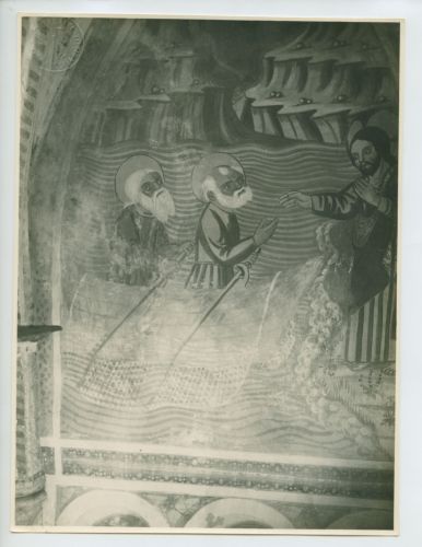 Riproduzione fotografica di un dettaglio degli affreschi dell'abside della chiesa di Sant'Andrea a Svino, paese della Slovenia vicino a Caporetto. Nella porzione di affresco è riconoscibile la scena della pesca miracolosa tratta dalla vita di Gesù.