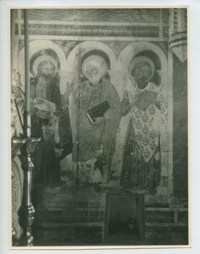 Riproduzione fotografica di un dettaglio dell'affresco absidale della chiesa di Sant'Andrea a Svino, paese della Slovenia vicino a Caporetto. Nella porzione di affresco sono rappresentati tre Santi.