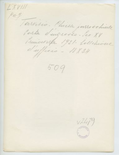 Riproduzione fotografica della porta d'ingresso alla Chiesa dei SS. Pietro e Paolo di Tarvisio (UD). La facciata della Chiesa appare com'era prima della ristrutturazione del 1959, ossia priva del porticato a tre arcate ogivali che oggi caratterizza il pronao dell'edificio.
