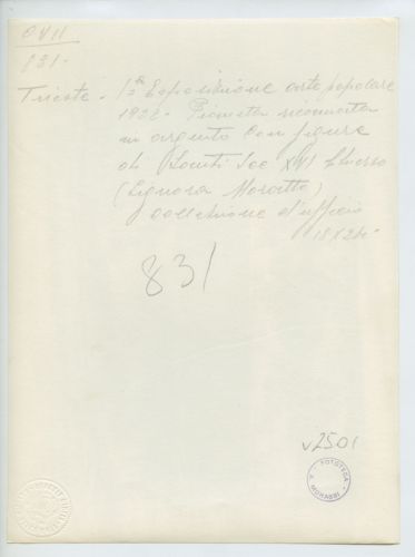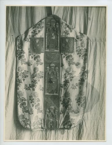 Riproduzione fotografica di una pianeta ricamata in argento con figure di Santi (sec. XVI) proveniente da Cherso (Croazia) ed esposta alla Prima mostra d'arte popolare italiana, che si tenne a Trieste nel 1922.