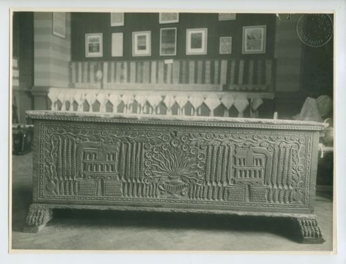 Riproduzione fotografica di un cassone in legno intagliato proveniente dalla Croazia ed esposto alla Prima mostra d'arte popolare italiana, che si tenne a Trieste nel 1922.