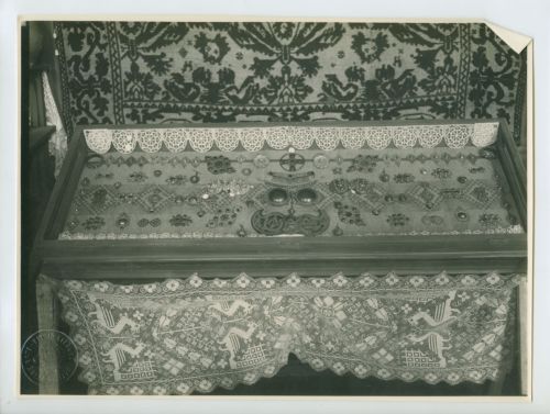 Riproduzione fotografica di un contenitore in legno contenente una collezione di orecchini di oreficeria dalmata, esposto alla Prima mostra d'arte popolare italiana, che si tenne a Trieste nel 1922.