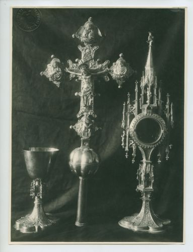 Riproduzione fotografica di alcuni oggetti liturgici (un crocifisso, un calice e un ostensorio) custoditi presso la Chiesa della Visitazione della Beata Vergine Maria a Santa Elizabetta, a Bale (Valle), Croazia.