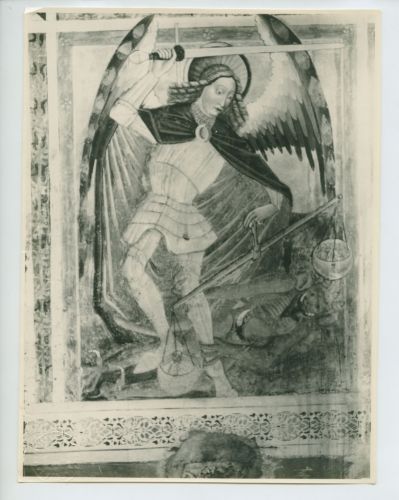 Riproduzione fotografica di un particolare degli affreschi del Santuario di Santa Maria alle Lastre, nelle vicinanze di Beram (Vermo), frazione del comune di Pisino (Croazia). Gli affreschi tardogotici, che decorano il santuario, sono stati realizzati da Vincenzo di Castua (sec. XV) e raffigurano scene religiose. Nello specifico, l'arcangelo Michele.