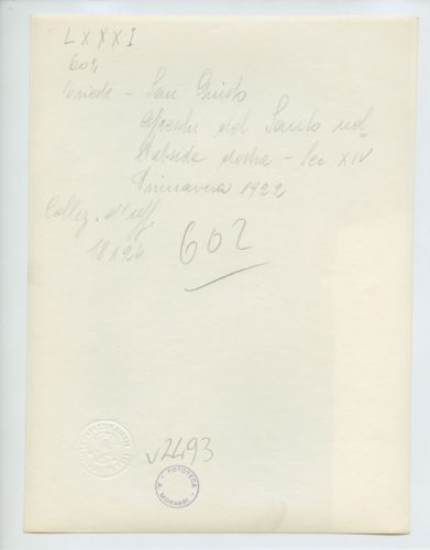 Riproduzione fotografica del campanile della Cattedrale di San Giusto di Trieste, ripreso dalla piazza antistante. Si notano pali di legno a puntellare la struttura, presumibilmente danneggiata a causa dei bombardamenti della Prima Guerra Mondiale.