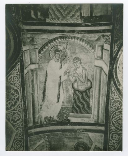 Riproduzione fotografica di una porzione di affresco con una scena religiosa presente nella Cripta degli affreschi della Basilica di Santa Maria Assunta di Aquileia.