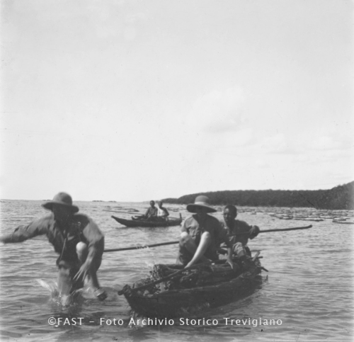 Raimondo Franchetti salta in acqua da una delle due canoe che percorrono il fiume Awash nella regione di Afar in Etiopia; viaggiano con lui una donna e tre indigeni.
