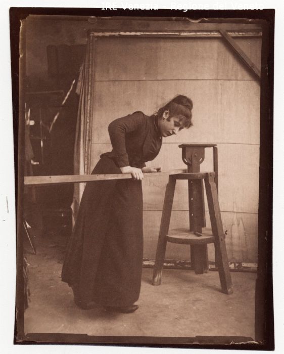 Una modella che mima l'atto di sporgersi stando appoggiata ad un asse di legno poggiato ad un cavalletto