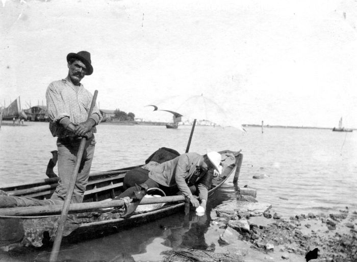 Un gondoliere e un passeggero, forse un turista, sono fermi in un sandolo, probabilmente dietro l'isola della Giudecca (è il Lido sullo sfondo?) presso una secca nella Laguna. Il gondoliere, che sta in piedi con il remo tra le braccia, guarda verso l'obiettivo, mentre il passeggero, con un cappello bianco, seduto sotto un ombrellone, si sporge in fuori a raccogliere o sciacquare qualcosa in acqua.