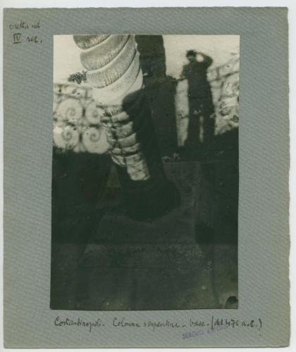 Riproduzione fotografica della base di una colonna serpentina (470 a.C.) a Istanbul (Turchia). é riconoscibile l'ombra del fotografo (Sergio Bettini)