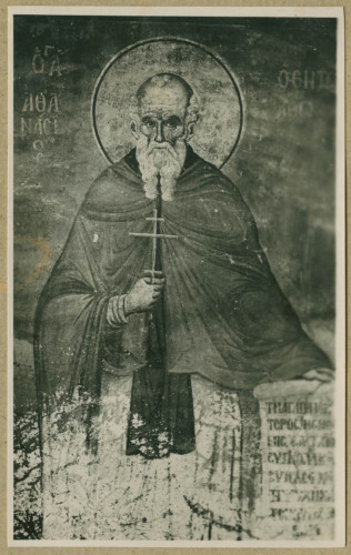 Monte Athos. Particolare di un affresco raffigurante Santo Anastasio Atonita.