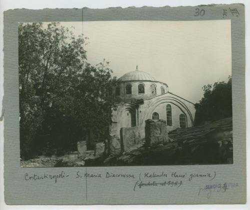 Riproduzione fotografica di una porzione esterna della Moschea Kalenderhane di Istanbul, una ex chiesa ortodossa convertita in moschea dagli Ottomani. Molto probabilmente la chiesa era originariamente dedicata alla Theotokos Kyriotissa. Questo edificio rappresenta uno tra i pochi esempi ancora esistenti di una chiesa bizantina con pianta a croce greca con cupola.