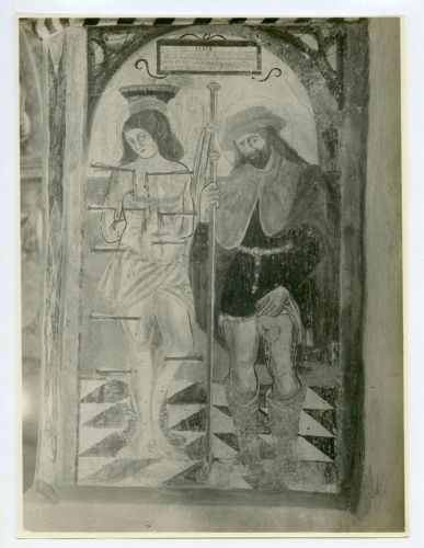 Riproduzione fotografica di un dettaglio raffigurante San Sebastiano e San Rocco dell'affresco absidale della Chiesetta di Santa Maria o Santa Apollonia presso Cormons, comune del Friuli Venezia Giulia.