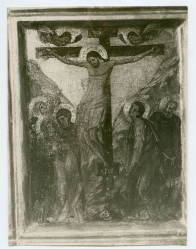 Riproduzione fotografica di un dipinto raffigurante la scena della Crocifissione.