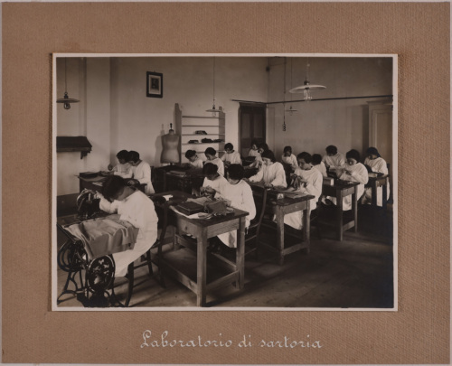Vista in diagonale, in direzione del fondo, dell'aula di sartoria nella Regia Scuola Industriale femminile di secondo grado "Pietro Scalcerle" di Padova, durante una lezione. Una delle alunne presenti è impegnata alla macchina da cucire, le altre nel cucito a mano. Sulla parete dell'aula, semplicemente arredata, si nota il ritratto di Benito Mussolini.