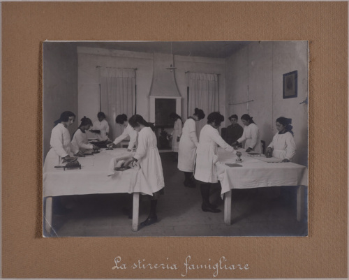 Vista leggermente decentrata, in direzione del fondo, dell'aula di stiratura nella Regia Scuola Industriale femminile di secondo grado "Pietro Scalcerle" di Padova, durante una lezione. Si nota la strumentazione di lavoro costituita da ferri da stiro a lastra e di più moderni ferri da stiro elettrici. L'aula è semplicemente arredata e mostra, nella parete di destra, il ritratto di Vittorio Emanuele III, re d'Italia.